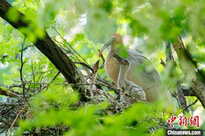 圖為“銅川籍”朱鹮在槐林中哺育幼鳥。 石銅鋼 攝