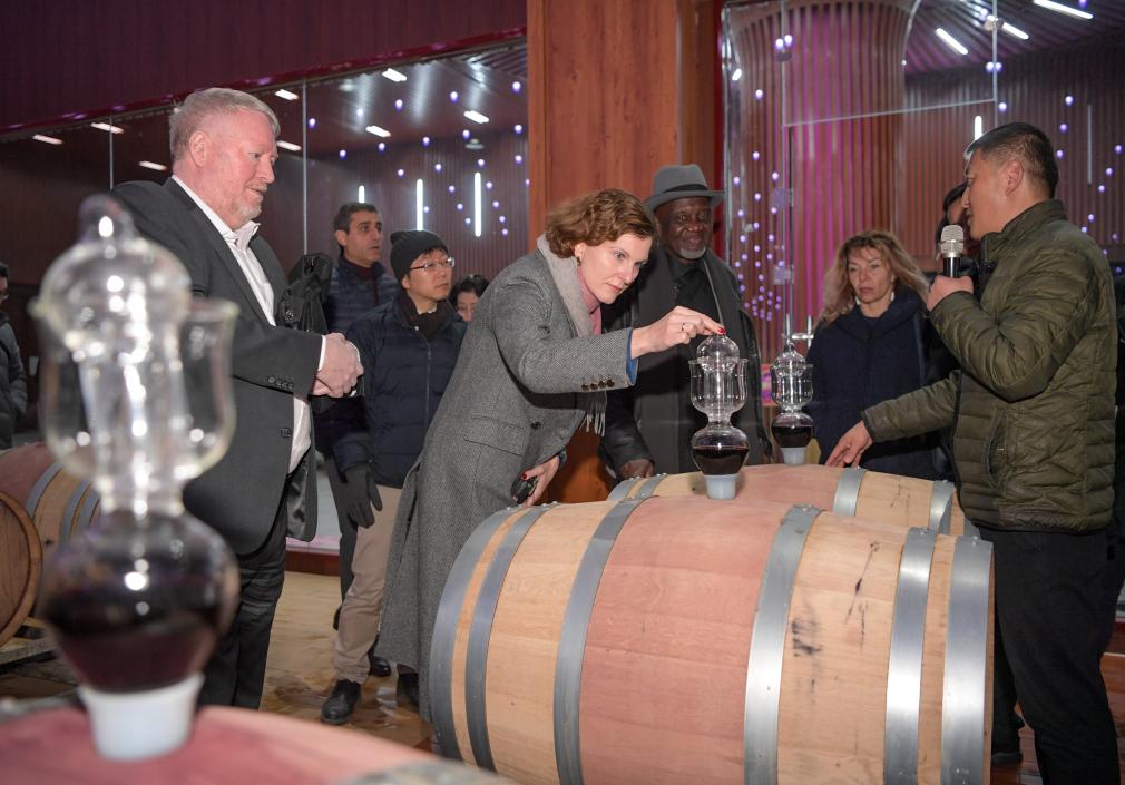 ▲駐華使節(jié)在寧夏銀川市永寧縣賀蘭神國際葡萄酒莊了解賀蘭山東麓釀酒葡萄冬季埋藤的原因(11月21日攝)。新華社記者 馮開華 攝