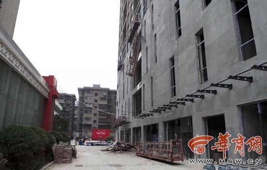 事情發(fā)生在昨日下午1時(shí)左右,事發(fā)樓盤為恒天財(cái)智大廈西側(cè)的一棟安置樓,該樓外立面垂吊著七八個(gè)鋼質(zhì)方形吊籃,其中東側(cè)一個(gè)吊籃一端下垂,掛在5樓位置。