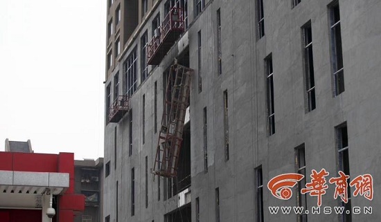 下午3時(shí)許,安監(jiān)部門工作人員在現(xiàn)場查看了出事吊籃。(記者 楊德合)