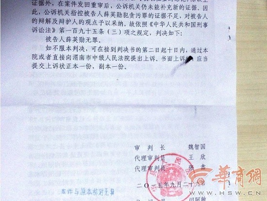 2015年9月30日,在國(guó)慶長(zhǎng)假的前一天,華縣法院重審以證據(jù)不足作出判決:被告人薛英勛無罪。