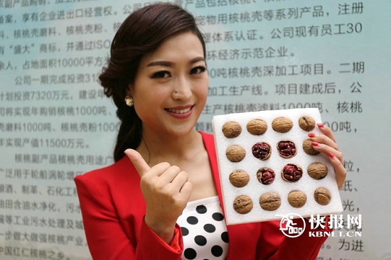 當(dāng)天,在商洛核桃展銷推介會上,快報網(wǎng)記者偶遇一身穿紅裙的女子,被諸多參展商邀請前去拍照。后經(jīng)了解,原來這位美女名叫謝菲,是商洛電視臺的主持人;她也是專程來西安參與商洛核桃展銷推介會主持工作的。在展會現(xiàn)場,謝菲儼然成了一道靚麗的風(fēng)景,大家都希望她能為商洛核桃多作推介。記者隨之跟拍,謝菲也很熱情地為家鄉(xiāng)的核桃做代言。