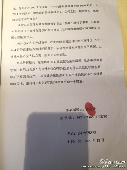 神木縣煤炭局地稅局,我叫徐光榮,現(xiàn)在實名舉報神木縣聚隆煤礦偷稅漏稅。陜西省榆林市神木縣聚隆煤礦疑似偷稅漏稅,非法出售“黑煤”。公開資料顯示:神木聚隆煤礦位于神木縣北西方向29km處,行政區(qū)隸屬神木縣孫家岔鄉(xiāng)管轄,由原四個相鄰小煤礦及周邊零星井田整合后劃定。經(jīng)陜西省國土資源廳批復(fù)的保有地質(zhì)儲量為4214。7萬噸,可采儲量2334.2萬噸,設(shè)計生產(chǎn)能力為60萬噸/年,服務(wù)年限為27.9年。記者一行來到神木縣多部門了解核實,去該礦對工人及聚隆當(dāng)?shù)厝罕娏私?,該礦所生產(chǎn)的絕大部分煤都不上稅,當(dāng)?shù)厝朔Q為“黑煤”,這些黑煤由張子勝等人組織發(fā)售。拉煤車在聚隆煤礦裝滿煤后,只收錢,不出票,由張子勝等人通過關(guān)系,“逃避”神木縣煤檢站檢查,而神木縣煤檢站也是形同虛設(shè),順利通過并且護送上高速公路。記者通過多方途徑尋找所謂的關(guān)系,但是工人們對此諱莫如深。該礦礦長為張子勝全權(quán)負責(zé)。在聚隆煤礦,記者看到幾十輛拉煤車正在排隊等著裝煤,可以聽見轟隆隆地機械聲,煤礦正在緊張生產(chǎn)作業(yè)。記者隨機采訪了一輛河南牌照的大車司機,問及這車煤拉往何地?有沒有煤檢票時,他告訴記者,“給河南那邊拉的煤,沒有票”。記者又問了旁邊幾輛拉煤車司機,得到回答都沒有票,隨后又來到開票處,其工作人員講“不開票110元,開票是160元”。據(jù)了解,2011年每噸煤須要上繳的各種稅費在100元左右,現(xiàn)在是50~60元,按照每個生產(chǎn)日生產(chǎn)4000多噸煤,每噸上繳稅費50元,每年生產(chǎn)300天來計算,一年的偷稅漏稅最少要6000萬元,從2011年到現(xiàn)在,偷稅漏稅的錢數(shù)將達2.4億元之巨,數(shù)額驚人!這些錢都進了誰的腰包?此前已有媒體對神木聚隆煤礦私放“黑煤”進行了報道,但是神木相關(guān)部門一直沒有對該礦進行查處。足見神木聚隆煤礦和該礦礦長張子勝能量巨大。另外該礦在生產(chǎn)過程中,嚴(yán)重威脅到附近村民的生存環(huán)境。2015年4月份在未經(jīng)當(dāng)?shù)卮迕裢庀?,私自拆除雷光斌等村民的房屋。已被神木縣治安大隊立案,但遲遲未被查處。當(dāng)?shù)鼐用褚蓡?,聚隆煤礦能如此瘋狂地偷稅漏稅,是否跟煤炭監(jiān)管部門有利益關(guān)系?與當(dāng)?shù)卮迕癜l(fā)生糾紛后為什么遲遲沒有被查處,煤礦仍然照常生產(chǎn)。到底誰是聚隆煤礦和張子勝的保護傘?