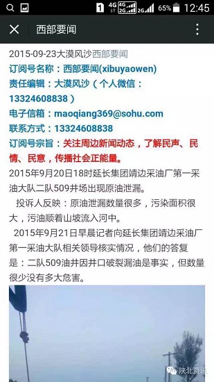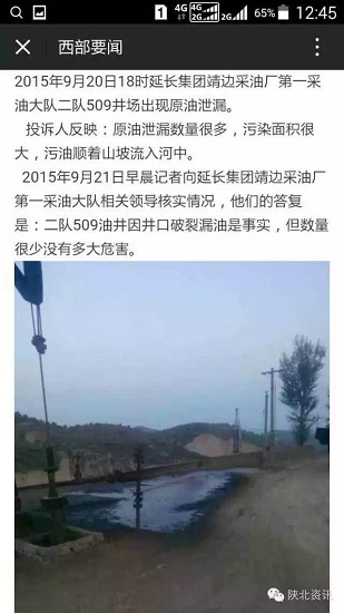 2015年9月21日早晨記者向延長(zhǎng)集團(tuán)靖邊采油廠第一采油大隊(duì)相關(guān)領(lǐng)導(dǎo)核實(shí)情況,他們的答復(fù)是:二隊(duì)509油井因井口破裂漏油是事實(shí),但數(shù)量很少?zèng)]有多大危害。