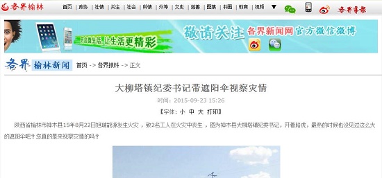 陜西省榆林市神木縣15年8月22日旭瑞能源發(fā)生火災(zāi),致2名工人在火災(zāi)中喪生,圖為神木縣大柳塔鎮(zhèn)紀(jì)委書記,開著路虎,最熱的時(shí)候也沒見過這么大的遮陽傘吧?您真的是來視察災(zāi)情的嗎?