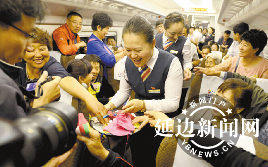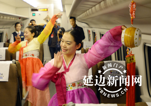 當(dāng)天12時(shí)48分,被冠名為“延邊金達(dá)萊號(hào)”的D22次列車由琿春站始發(fā)開往北京,與其他動(dòng)車組車型相同的“延邊金達(dá)萊號(hào)”無(wú)論是內(nèi)部飾品、座椅、靠背還是車門展示板,均添加了延邊朝鮮族民族元素,意圖將延邊朝鮮族民族特色集中對(duì)世人展示。