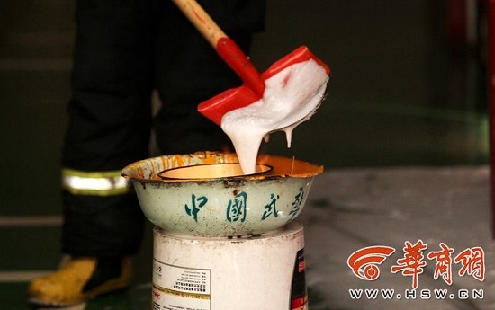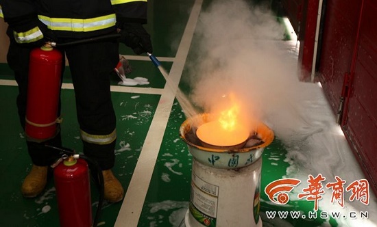 2015年9月13日,西安市西華門,西安市公安局消防支隊西華門中隊,使用干粉滅火器瞬間將燃燒的甲醇撲滅。