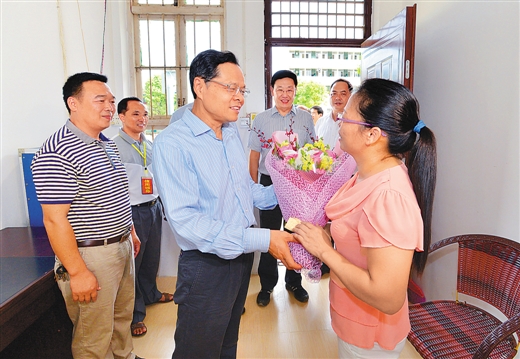 陳武先后走訪了都陽中學、都陽鎮(zhèn)中心小學,察看學校辦學條件,了解師資隊伍建設情況,向老師們致以節(jié)日問候。從事英語教學的覃俏麗老師是都陽中學唯一一個女班主任,陳武對她說:“學好英語能幫助貧困山區(qū)的孩子走向更廣闊的世界,你的使命光榮!”從教23年的小學高級教師覃紅蘭長期扎根基層,雖然辛苦,可孩子們的成長更給她帶來快樂,陳武勉勵她繼續(xù)努力,“斬斷窮根靠你們”。
