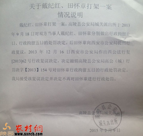 2015年7月28日,高陵區(qū)公安局在接到西安市公安局第二次行政復議決定書后,再次對田懷章做出“給予田懷章行政拘留三日”的處罰決定。同樣,高陵區(qū)公安局在執(zhí)行中依據(jù)相關法律,采取了不予執(zhí)行行政拘留處罰。盡管這樣,田懷章認為,在西安市公安局兩次行政復議決定書下達之后,高陵區(qū)公安局做出的處罰決定沒有實質(zhì)性的改變。至于是否被執(zhí)行和處罰決定不是一回事。況且,此前的2015年2月9日,城關派出所出具的一份《關于戴某、田懷章打架一案情況說明》中稱“我局接受該復議(指2013年12月16日,西安市公安局做出西公法行復(2013)62號行政復議決定書)決定并決定不再對田懷章進行行政處罰”。