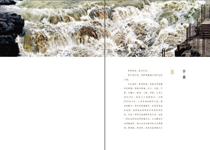 書籍設計構思獨具匠心,整書設計以河為主線。封面是河灘,凹壓的字跡是行走上面留下的印跡,鏤空的工藝增加透視效果的同時,還能產(chǎn)生光影效果,扉頁是河流翻滾疊出的浪花,書中到處藏著水元素符號,處處感受母親河在流淌。