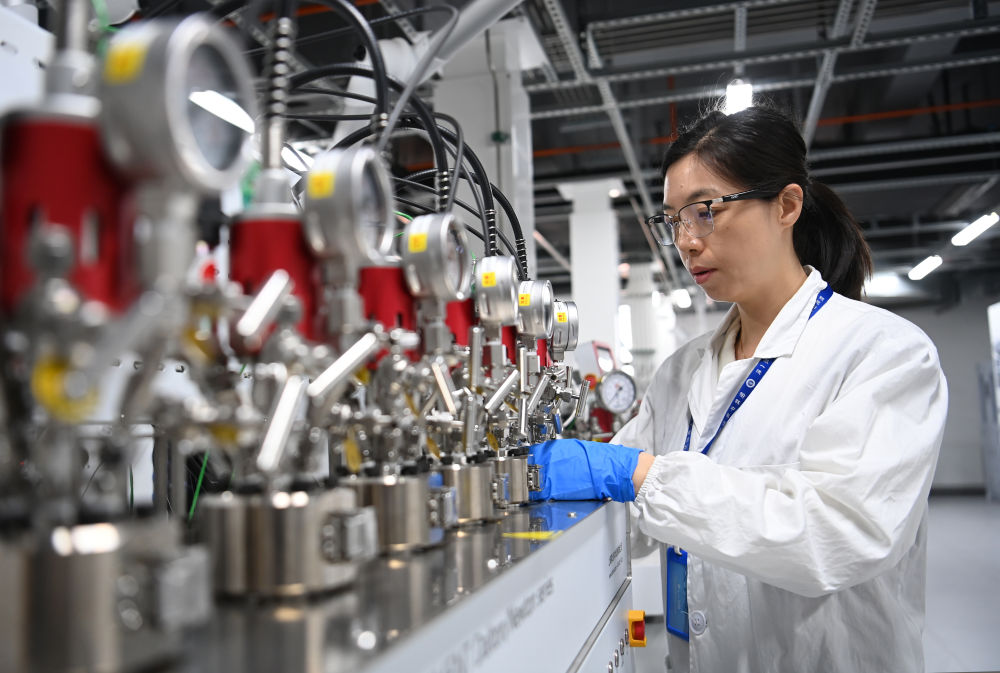 ??工作人員高巧利在陜西省榆林中科潔凈能源創(chuàng)新研究院工藝放大平臺實驗室制備催化劑小試樣品(2024年2月28日攝)。新華社記者 鄒競一 攝