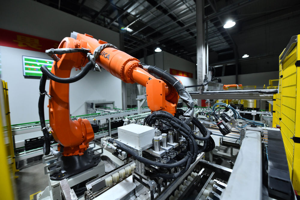 ??在廣西柳州市一家新能源汽車電池生產(chǎn)企業(yè),機器人在生產(chǎn)線上作業(yè)(2023年5月10日攝)。新華社記者 黃孝邦 攝