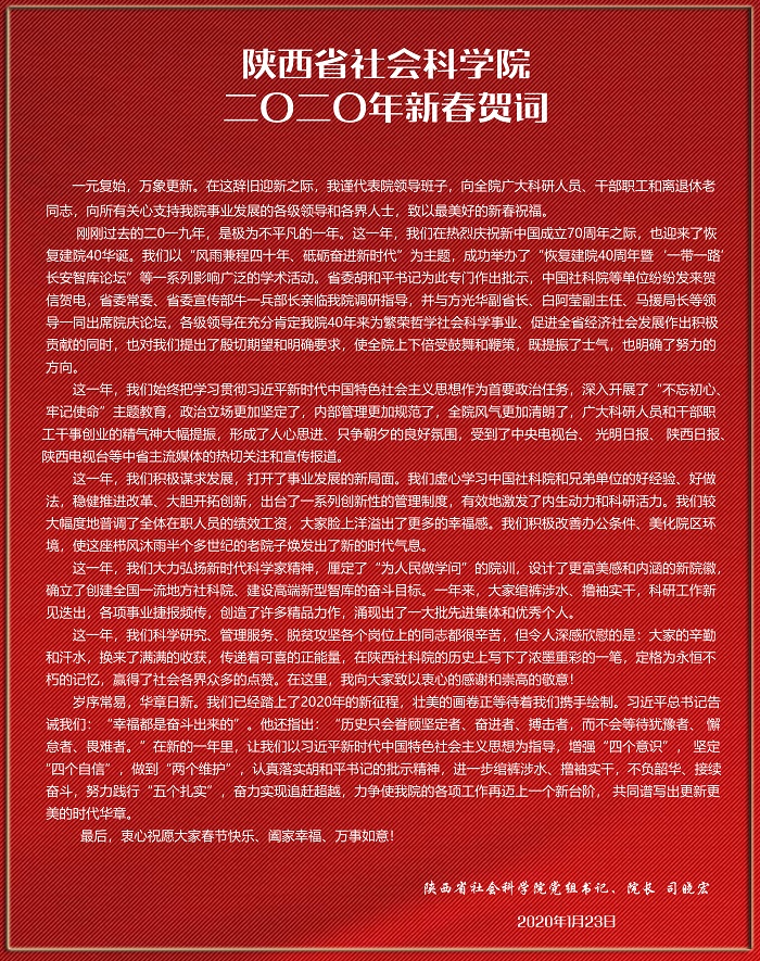 陜西省社會(huì)科學(xué)院二0二0年新春賀詞