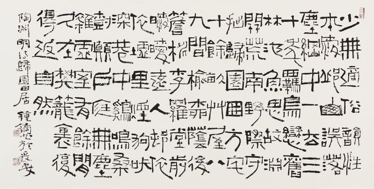 鐘鏑的鏑字有兩種解釋:一是指箭頭,也指箭;二是一種金屬元素,用于原子能工業(yè)和激光材料等;總的講是一種硬性物質(zhì),鏑前加一鐘,都與金石有關(guān),這對(duì)于篆刻家的鐘鏑來(lái)說(shuō),名字確實(shí)起得跟他的俊美一樣,不好挑剔。我第一次接觸鐘鏑,是在太白書院的一次書畫展上,有一個(gè)八條屏很是搶眼地占了半扇墻,那字橫七豎八,亂石鋪街,完全是目空一切的張揚(yáng)放大,用另類兩字結(jié)論頗為精準(zhǔn)。我問(wèn)鐘鏑是誰(shuí),朋友一指,但見一個(gè)小帥哥鶴立雞群地戳在一伙丑男之間,一派新潮感,我當(dāng)時(shí)最突出的感覺(jué)是距離二字。后來(lái)接觸多了,外表的強(qiáng)烈印象漸漸褪去,留下的是一個(gè)骨架硬朗,為人周正,心地良善,面冷心熱的硬派小生形象,我們的交道才多了起來(lái)。